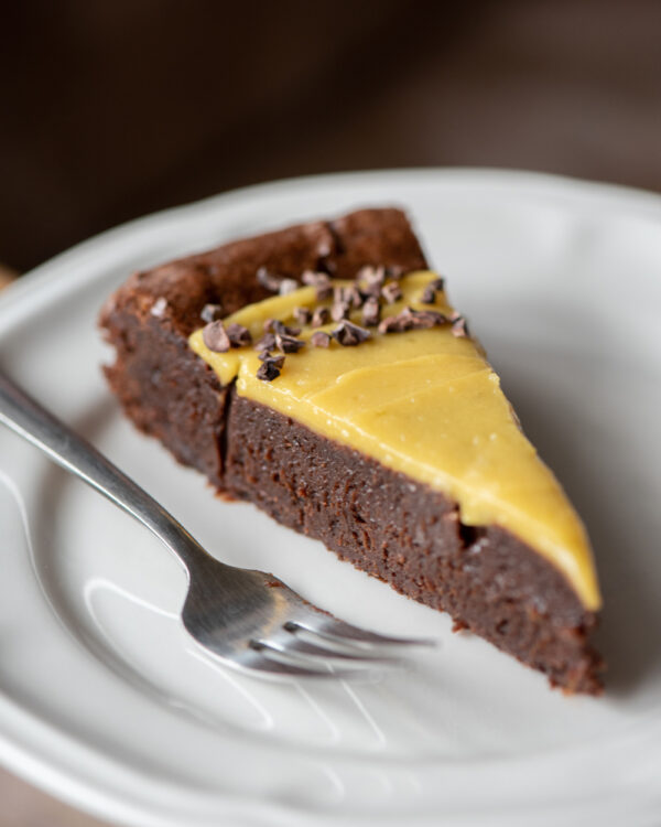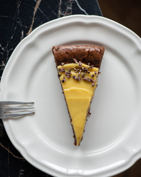 Brownie z gorzkiej czekolady z konfiturą marakuja i prażonymi ziarnami kakao